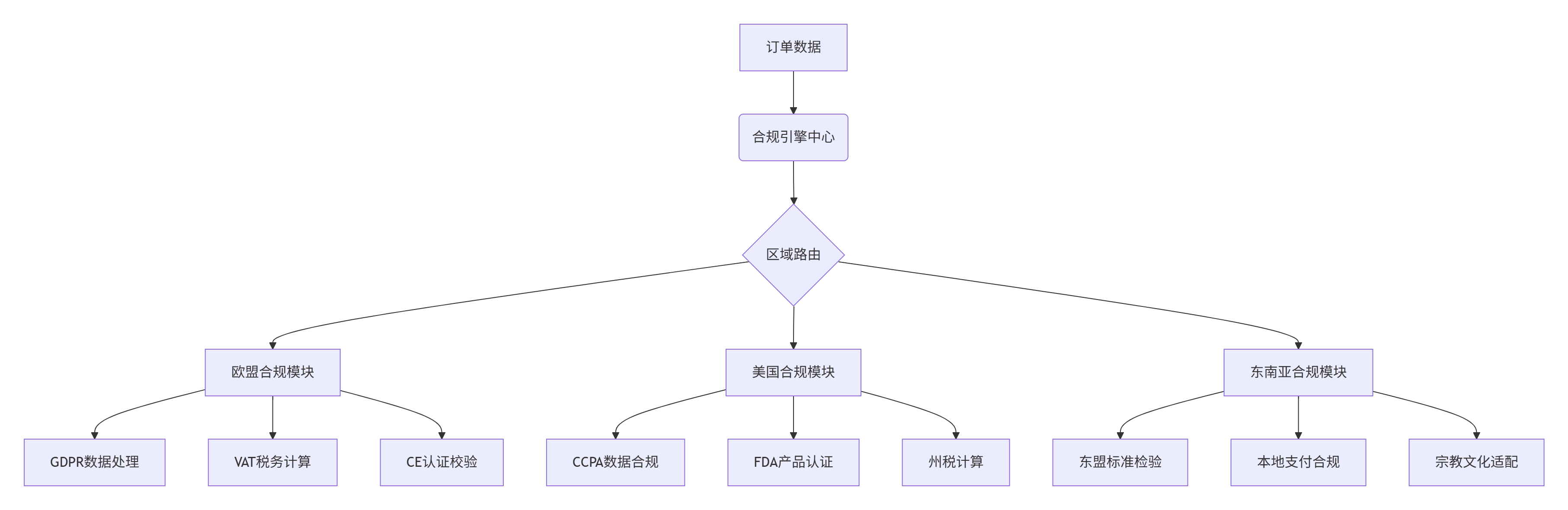 这种"合规中台"架构允许企业快速适配不同市场的监管要求,将合规检查嵌入业务流程的每个环节:商品上架前的资质审核、订单生成时的税务计算、发货前的海关编码校验、售后环节的消费者权益保障等。